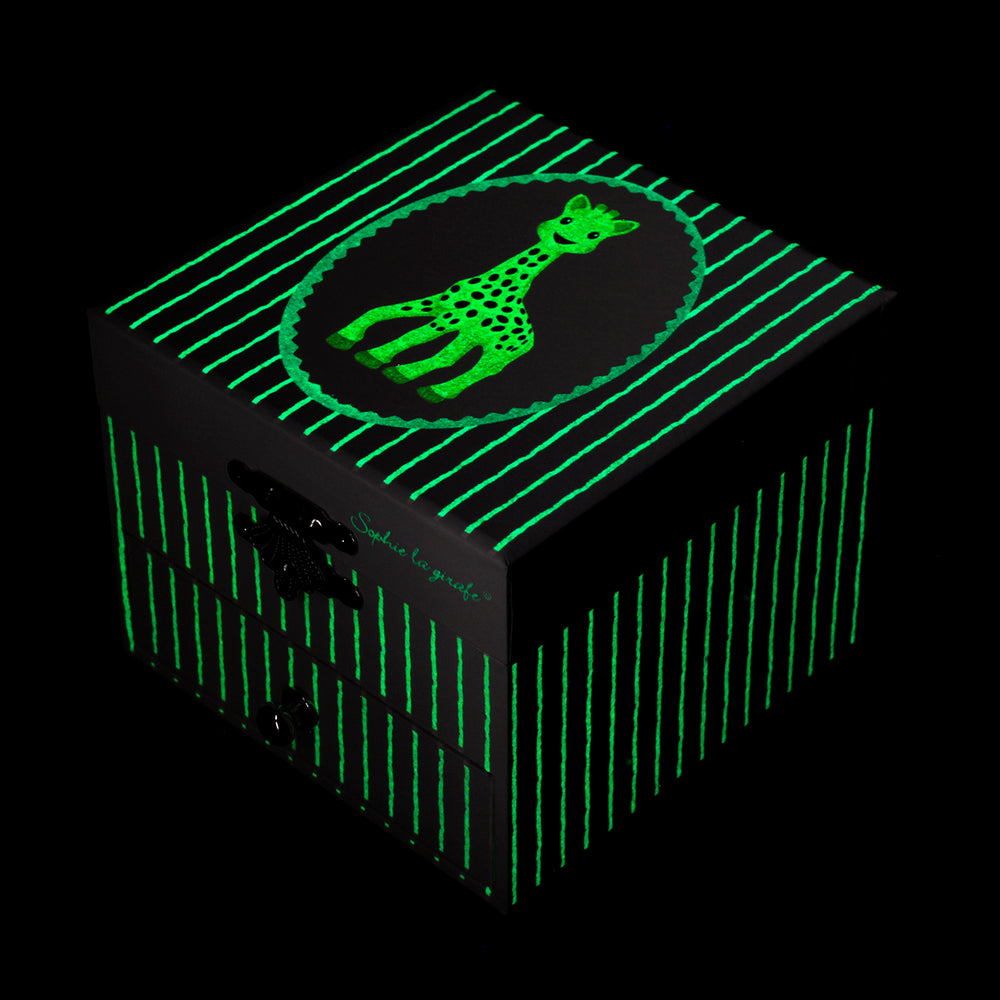 This cube shaped music box with a drawer will amaze your child who will store his/her treasures in it. Wind-up the key and the Sophie the Giraffe figurine comes to life as if by magic to the sound of music!