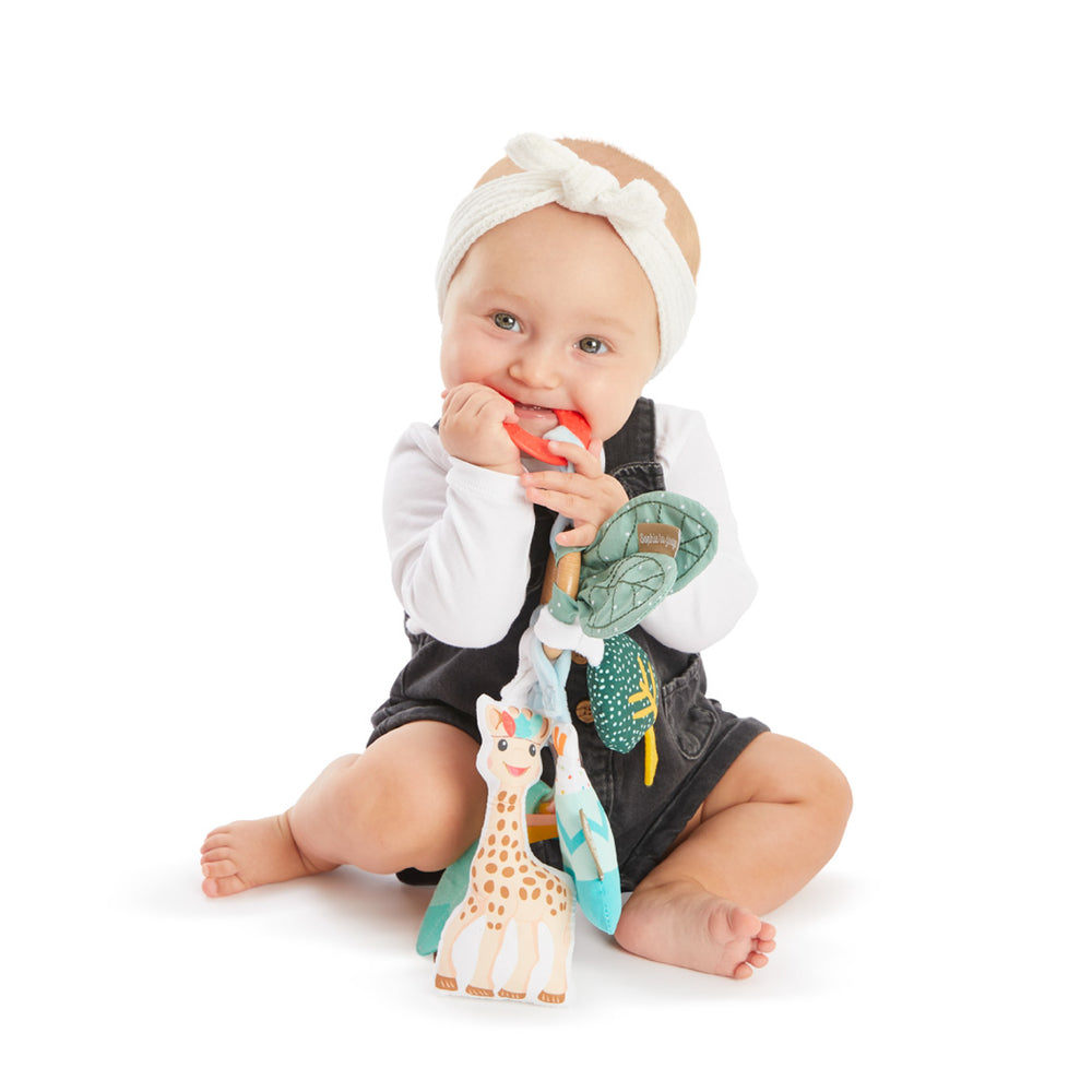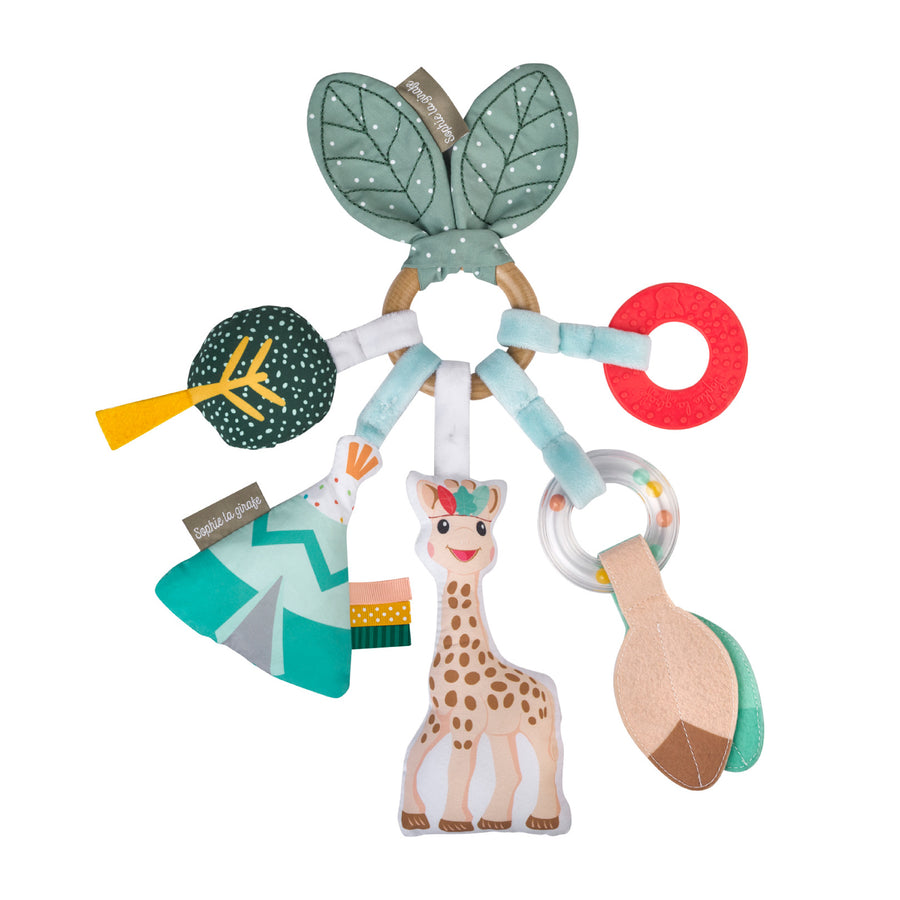 Baby develops his senses and motor skills thanks to the multitude of activities around the central wooden ring: transparent rattle, whistle, bell, crumpled paper, labels, teething ring...