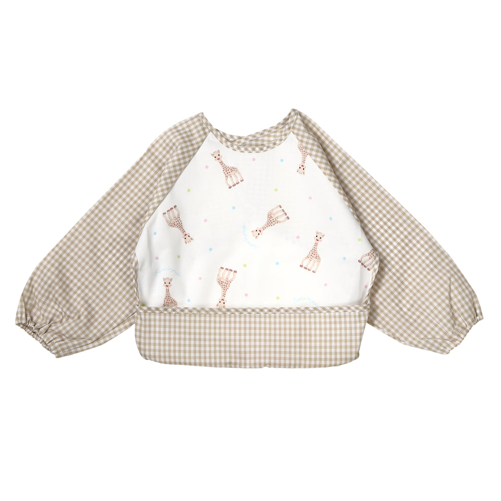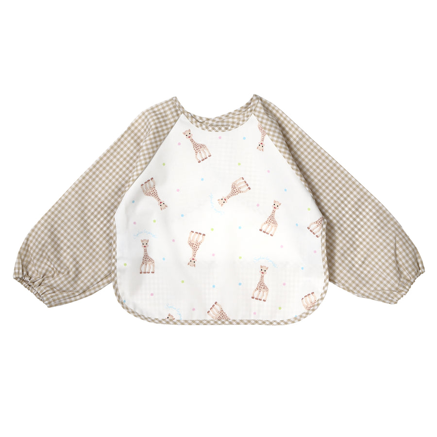 愛らしい顔のキリンのソフィーをあしらった、お食事タイムには欠かせない袖付きエプロン。食べこぼしをキャッチするポケット付き。デイリーにはもちろん、お祝いやプレゼントとしてもオススメです。
